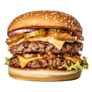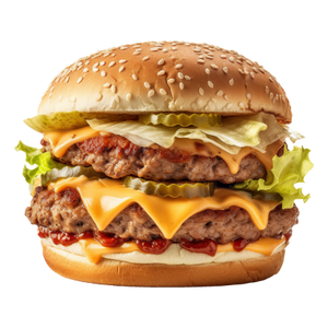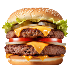 Two Angus beef patties with tomatoes, lettuce, cucumbers, topped with bacon and cheese