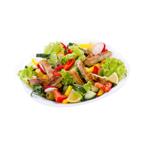 Grilled chicken served over fresh greens with cucumbers and tomatoes.