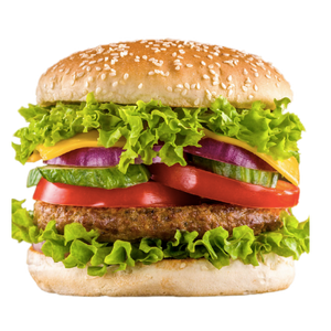 Angus beef patty with tomatoes, lettuce, cucumbers, topped with bacon and cheese